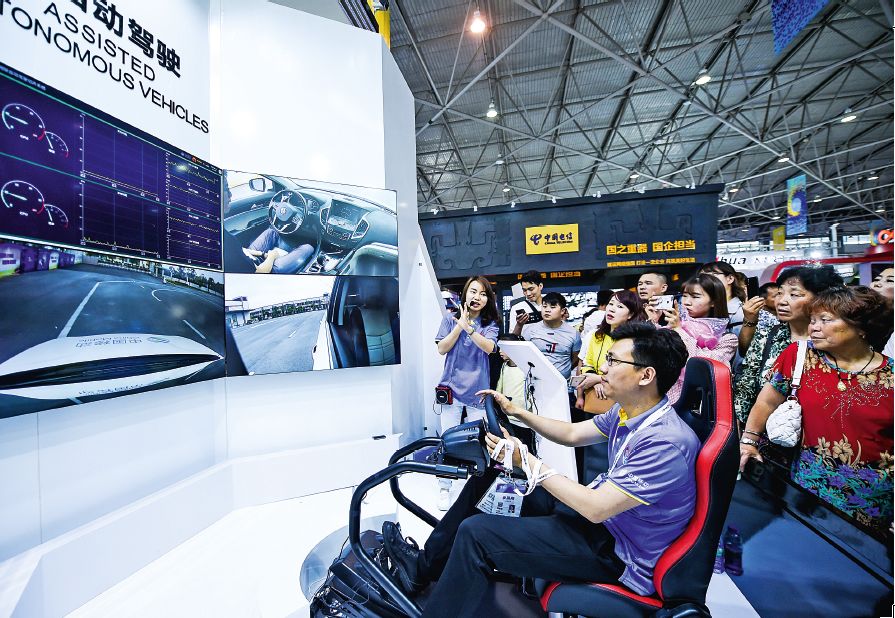 参展商在2018中国国际大数据产业博览会上向参观者介绍5G远程自动驾驶。图/新华