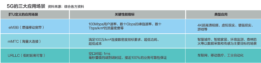 每一次的通讯技术迭代,更高的网络速率是升级重点,速率的提升将被应用于很多垂直行业中。5G定义了三大业务场景:eMBB(增强型移动宽带)、mMTC(海量机器类通信)、uRLLC(超可靠低时延通信)。