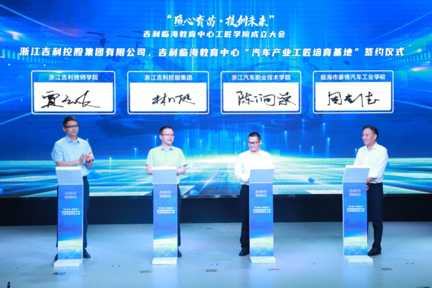 集团领导与吉利临海教育中心三校校领导共同为工匠学院成立揭幕,聘任“党的十九大代表”、“全国优秀共产党员”、“全国劳动模范”、“全国技术能手”吕义聪为工匠学院院长,聘任“第十四届全国人大代表”、“浙江省劳动模范”、“杰出台州工匠”费少标为工匠学院副院长临海教育网,聘任获得国家、省市、集团等各级荣誉的34位工匠为吉利临海教育中心工匠学院“工匠之师”。浙江吉利控股集团有限公司与浙江汽车职业技术学院、浙江吉利技师学院、临海市豪情汽车工业学校(台州汽车工业学校)签约共建“汽车产业工匠培育基地”。