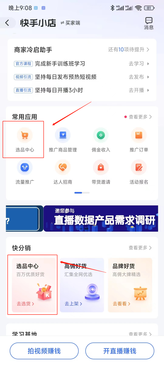 (2)点击快手主页的快手小店来到买家端,点击选品中心,两个选品中心是一样的,随便点哪个。
