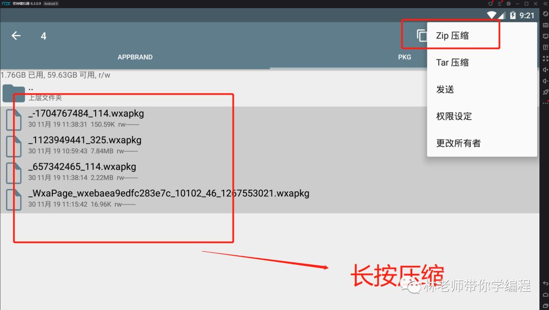 找到源文件后,长按左键 -> 点击右上角三个小点,打开菜单,选择‘压缩所选文件’->完成后,点击查看->长按,还是右上角,将压缩包从模拟器发送出来到电脑上,方式多种,随意。下图是以QQ方式发送。
