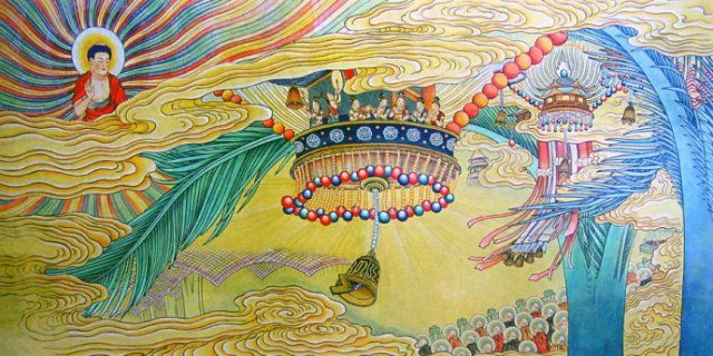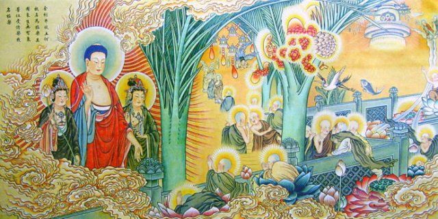 舍利弗,彼佛国土,微风吹动诸宝行树及宝罗网,出微妙音,譬如百千种乐同时俱作。闻是音者,自然皆生念佛、念法、念僧之心。
