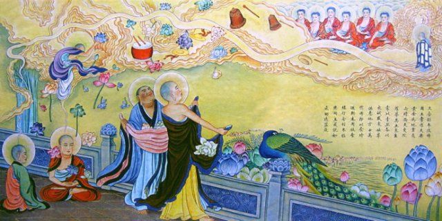 舍利弗,众生闻者,应当发愿,愿生彼国。所以者何?得与如是诸上善人俱会一处。