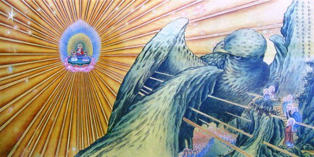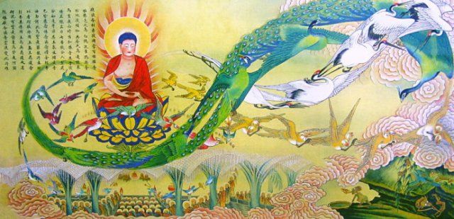 复次,舍利弗,彼国常有种种奇妙杂色之鸟:白鹤、孔雀、鹦鹉、舍利、迦陵频伽、共命之鸟。是诸众鸟,昼夜六时出和雅音,其音演畅五根、五力、七菩提分、八圣道分如是等法。其土众生闻是音已,皆悉念佛、念法、念僧。