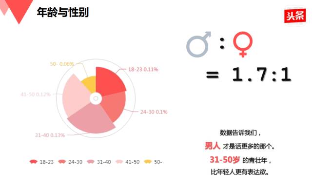 研究发现,在评论用户中今日头条用户分析,男女比例为1.7:1,其中31-40、41-50岁的用户群体评论率排前两位。