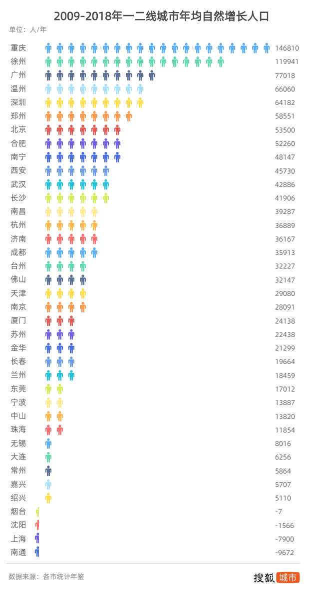 不过,考虑到每年的死亡人口数量,各大城市过去10年的平均人口自然增长数量就有了较大的变动。年均自然增长人口仍有10万以上的只剩下重庆和徐州,5-10万的仅有广州、温州、深圳、郑州、北京和合肥,西安、武汉等21个城市年均自然增长人口在1-5万之间,烟台、沈阳、上海和南通出现负增长。