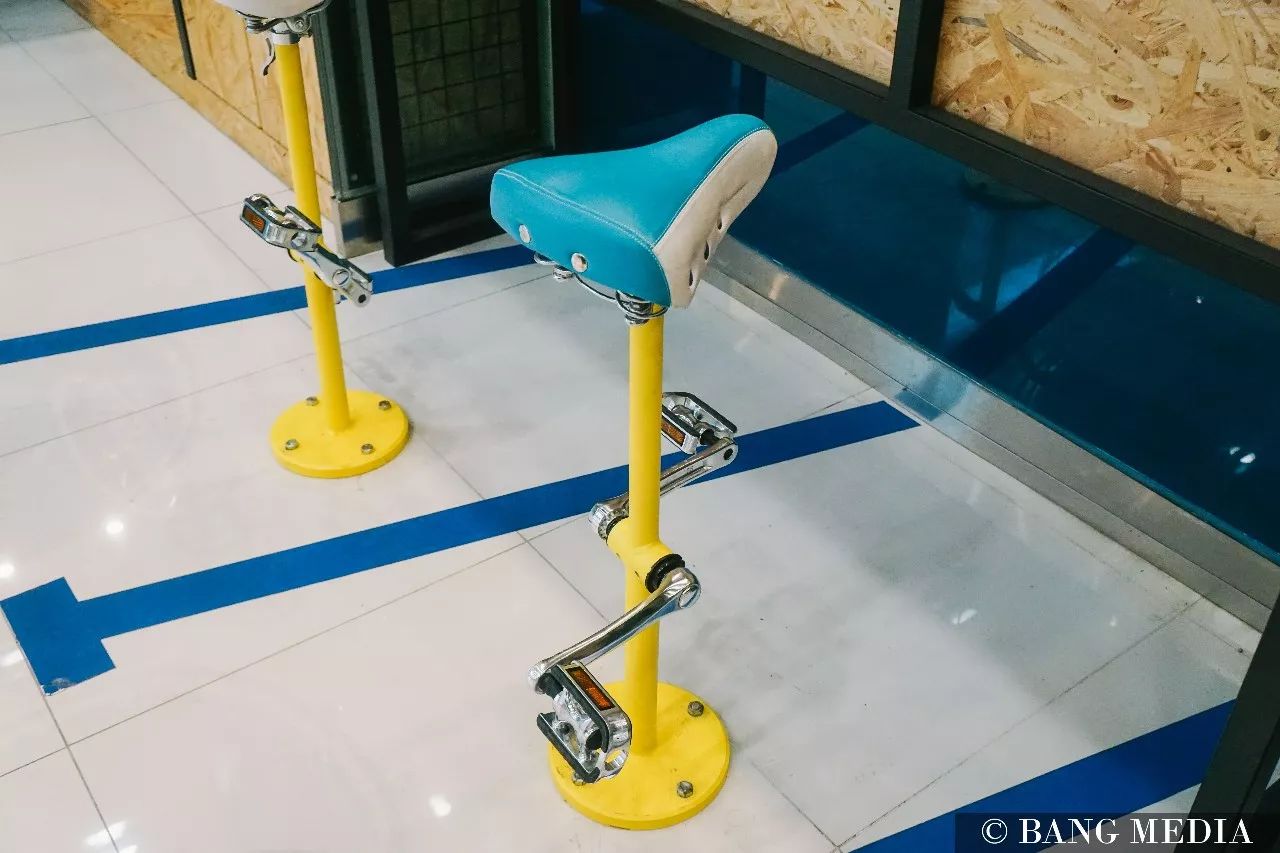 小到车铃做桌上的点单铃,甚至连座位都是由自行车的车座做成的。