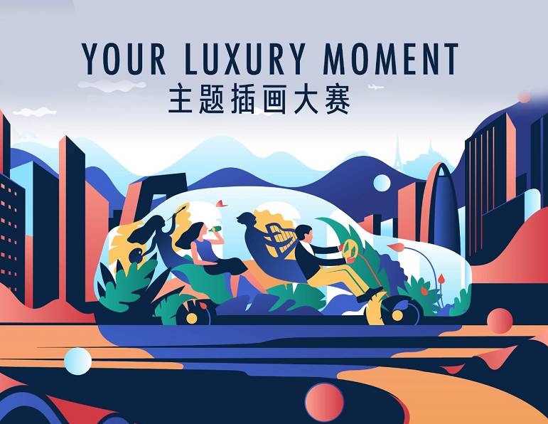以“你的奢享一刻(YOUR LUXURY MOMENT)”为主题,创作一幅插画。内容积极向上,投稿作品中须符合主题滴滴豪华车,滴滴豪华车的品牌logo,司务员形象、汽车、服务形式均可为可选元素。