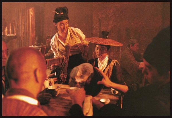 《新龙门客栈》(一九九二年)是对胡金铨《龙门客栈》(一九六七年)的翻拍。胡版虽然也有女演员,但没有任何男女戏,电影是“三岔口”的节奏,一方人马上,再一方,打一场,第三第四方上,混打,最后决战。这种戏剧结构,基本还是五幕剧的时间分割,重要的五场打戏分割出五个板块。但七十年代末开始,港片迈入新时代,香港电影新浪潮不仅生产了灿若星河的编导梦之队,更为黄金时代的香港电影准备了观众。港片产量大增,竞争激烈。胡金铨创造的武侠节奏跟黑泽明的武士片一样,已经吊不住观众越来越饕餮的胃口,而如果每本打一场,也会过于单调又吵闹。徐克的做法就是,把五幕剧改造成九宫格,每段十分钟,杂以打戏或床戏,软硬兼施,双管齐下。《新龙门客栈》因此就被改造成双女主双男主戏,更在张曼玉、林青霞和梁家辉之间设置情感连环。电影开场第一个十分钟,大太监甄子丹杀忠良,流放忠良后人;第二个十分钟,林青霞出手救人,甄子丹故意放水;第三个十分钟,龙门客栈老板娘张曼玉床戏出场,开的是人肉包子黑店;第四个十分钟,张曼玉一丝不挂初见梁家辉,准床戏确立她将介入林青霞和梁家辉之间的情侣关系;第五个十分钟,东厂人马和江湖侠客同店住下,两边都想和张曼玉做密道交易;第六个十分钟,张曼玉对梁家辉说“老娘钱也要,人也要”;第七个十分钟,梁家辉为换取密道,和张曼玉成亲;第八个十分钟,三人和东厂厮杀;第九个十分钟,三人斗大太监甄子丹,林青霞死。打戏交织床戏,不给观众一分钟的分神机会。