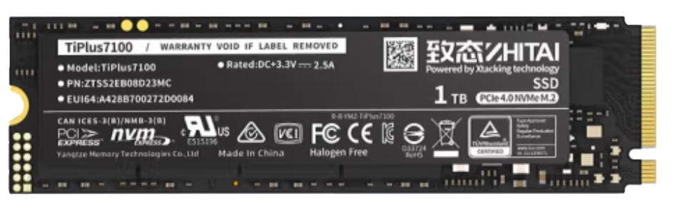 首先是致态最新的中高端 PCIe4.0 盘 TiPlus7100,2TB 800 元左右的价格,支持致态最新的 X tacking 3.0 技术,极限性能很强,实测 TLC 直写性能和 SLC cache 下的 4K 性能几乎摸到了有缓旗舰盘的屁股。
