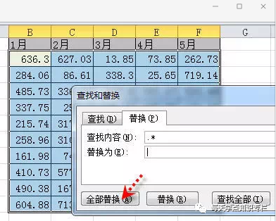 选取数字区域,ctrl+h打开替换窗口,查找.*,替换留空 然后点全部替换即可。