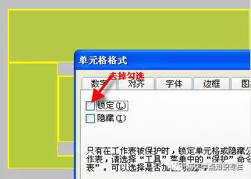 步骤1:按ctrl键,选取所有黄色的区域,然后按ctrl+1(数字1)打开“单元格格式”窗口,在锁定选项卡中,去掉“锁定”前面的勾选。