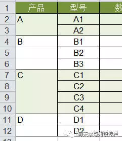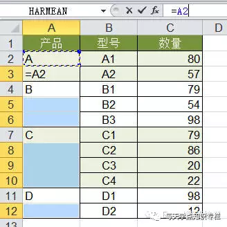 第三步:选取A列,CTRL+G定位 – 空值,在编辑栏中输入=A2,再按CTRL+Enter完成填充