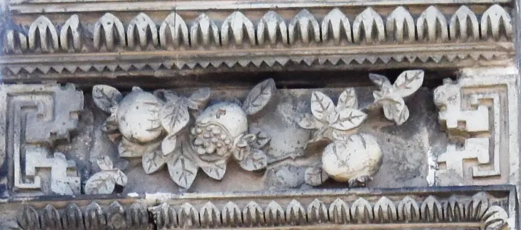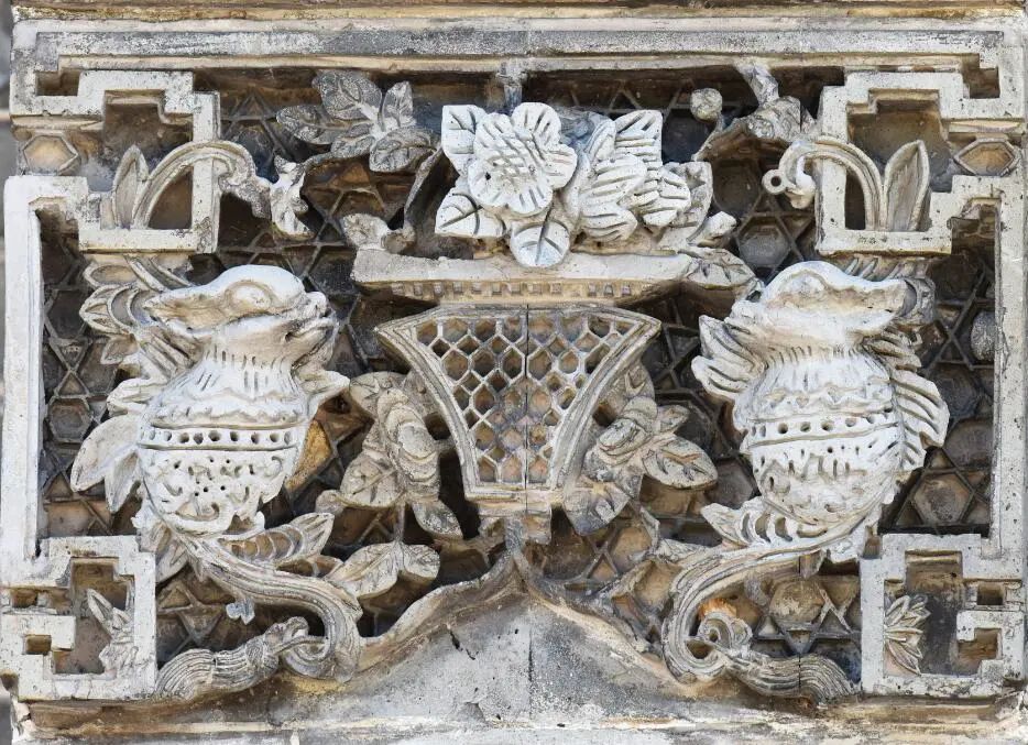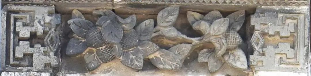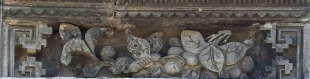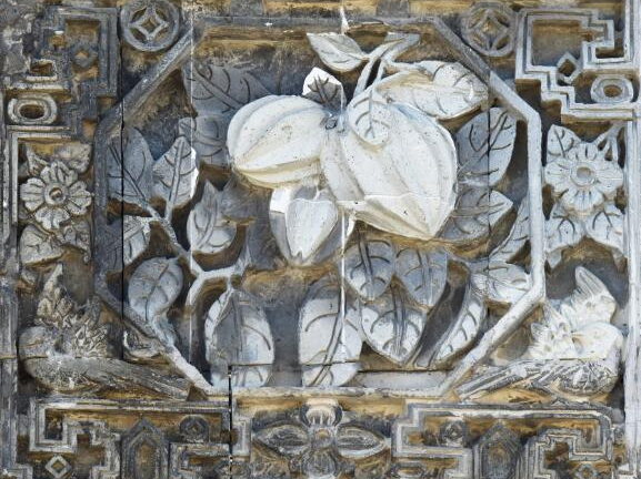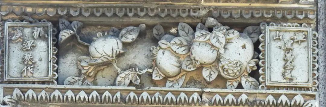 我们看到,墀头座宽高比约为 1:1,一般构图为周边是博古花架,多运用浅浮雕技法表现,中间为矩形或圆形或其他等边几何形的中心图案,有多边形内框、海棠内框、方形内框或者无内框等形式。题材以图案组合为主,画心一般装饰有花篮、蝙蝠、佩环、岭南瓜果、花鸟、场景人物等主题图案,它们可以任意搭配不同装饰主题的墀头身。