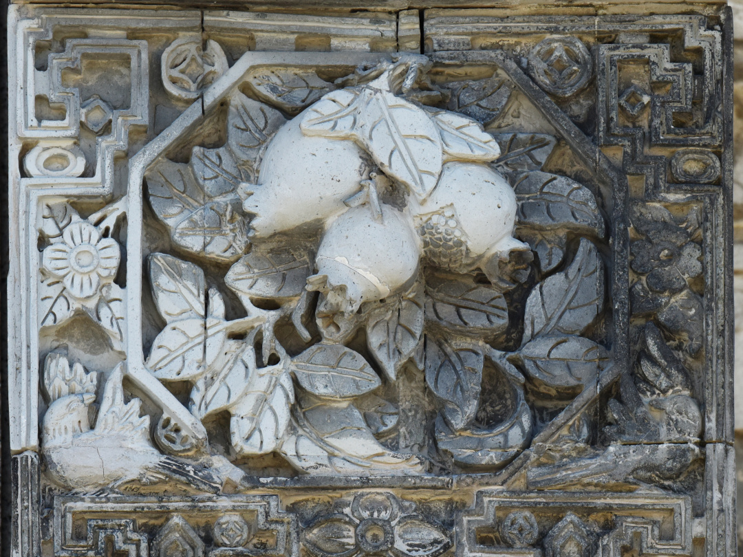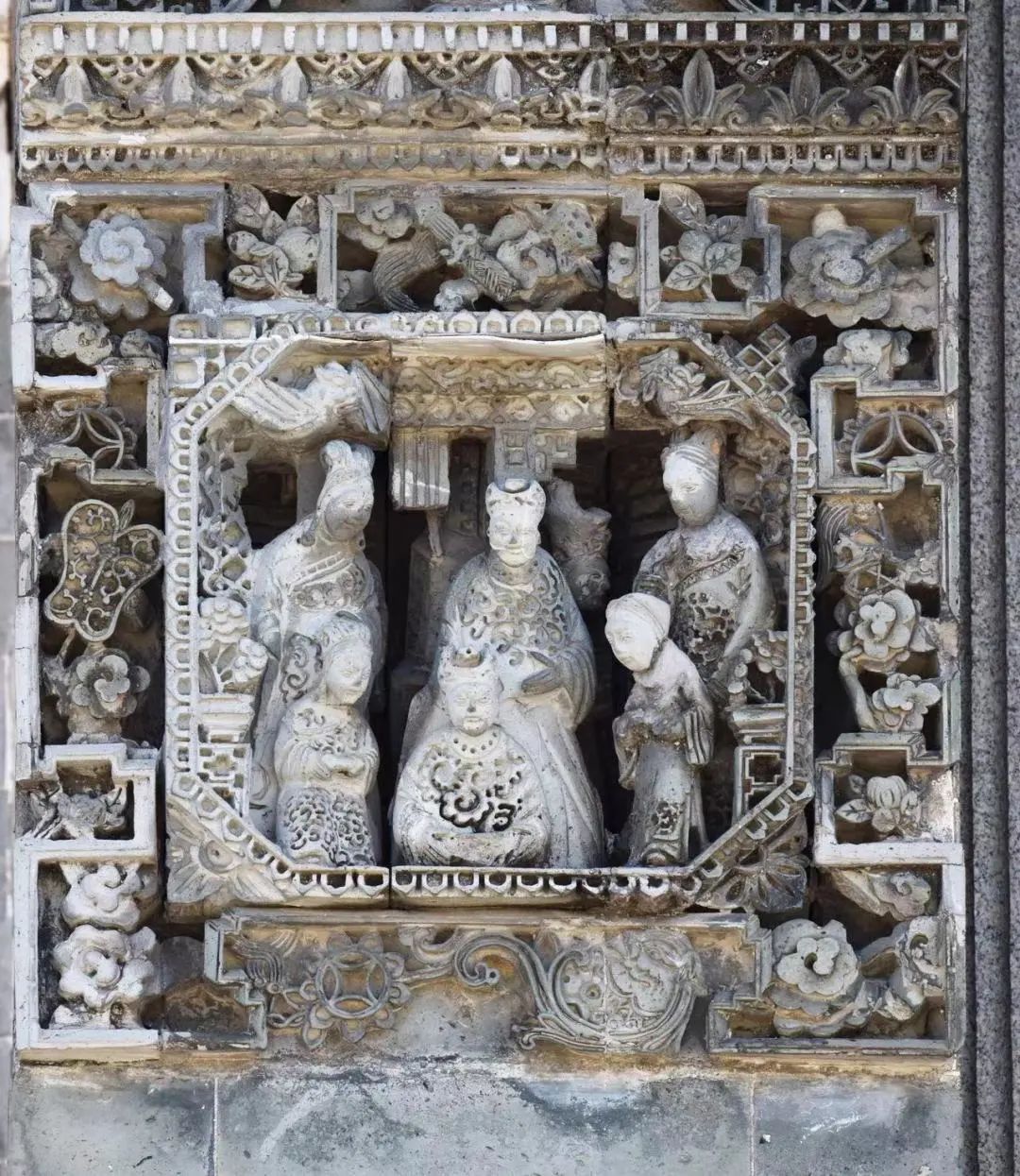 相比起在墀头过渡层的广泛应用,寓意吉祥的岭南佳果图案在墀头座的应用频率相对较低,但画面感较强的场景人物、花鸟图等则是座上常客。在资政大夫祠,我们还看到了墀头座常见的花篮图案,据说“篮”与“男”谐音,寓意多子多孙。