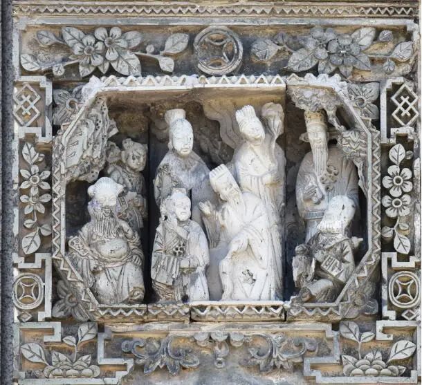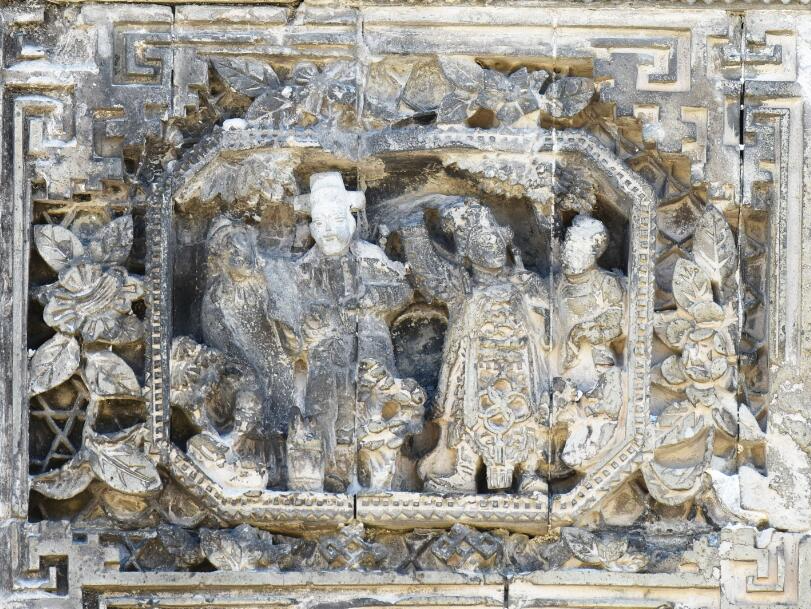 是的。当我们仰视墀头装饰的时候,会发现墀头顶和墀头身均有砖雕花边装饰,如同两张相框。到晚清民国时候,砖雕的内容有所变化,尤其是墀头身以戏曲故事为主的转变。砖雕上的戏曲人物性格突出、神情逼真、神态各异,气氛喧闹热烈。人物面部造型丰腴、惟妙惟肖,尤其在服饰褶皱、胡须间隙上更能显示出匠人的技艺。整体造型上注意到了“近大远小”的观感效果,整个故事场景层层叠叠、错落有致,令人叹为观止。