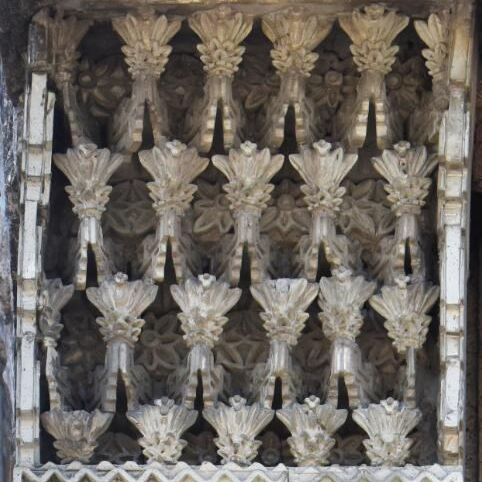 资政大夫祠建筑群头门墀头顶为变异的如意形斗拱,而且变异有两种形式:一是上部“斗”的造型为花朵或叶簇,下部造型依然仿照木构件中斗的传统做法;二是上部的“斗”和下部的“拱”都产生变异。此外,墀头顶还通过花叶纹单元重复排列、上下错开而组成叠涩。因这类墀头顶的纹样既似花朵又似叶子,且有不少是复合纹样,所以统一称为花叶纹。包括资政大夫祠、南山书院和亨之徐公祠在内,全部属于此种类型。