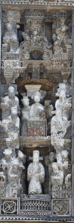 这主要是为了便于突出砖雕的立体感和便于远观。除了砖雕外,木雕和石雕也有类似情况。此外,与灰塑、陶塑鲜艳的色彩对比,砖雕色泽朴实,加上所刻绘题材多为牡丹、玉兰、杏花、瑞兽、三星、为官等富贵题材,为整座建筑起着点题的作用,各种装饰手法的融会贯通则反映出宗族雅俗共赏的审美心理。