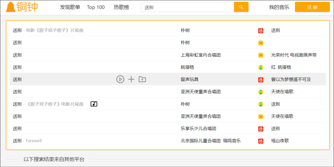 铜钟音乐搜索的歌曲来自各大音乐平台,网易云,QQ,酷我、酷狗等等,曲目很全面mp3歌曲免费下载mp3,不仅可以在线听,还可以免费下载歌曲