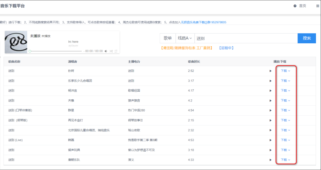 搜索歌曲后,点击播放,可以在线听歌,也可以点击下面的下载按钮,下载歌曲