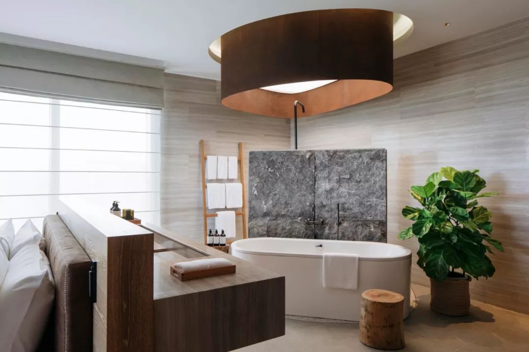 ▲ 在三亚海棠湾阳光壹酒店全开放格局的浴室中,设计师巧用回收铁皮制成的“从天而降”的管状吊顶,为沐浴区营造了一道极为抽象的屏障。