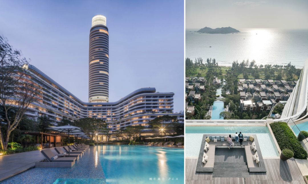 ▲左侧为体量略大的酒店建筑群希尔顿逸林、右侧为全泳池别墅格局的奢华度假村——海棠湾康莱德。