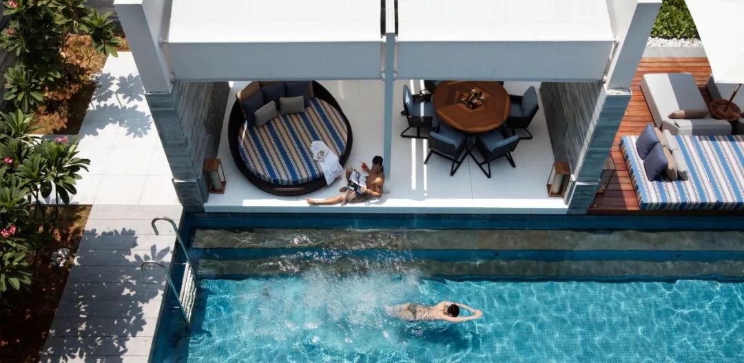 ▲底楼住客可以打开阳台栏杆,直接跃入由热带花园掩映的礁湖泳池,这一革新的客房形态充分展现和激励着三亚度假酒店的创作才情。
