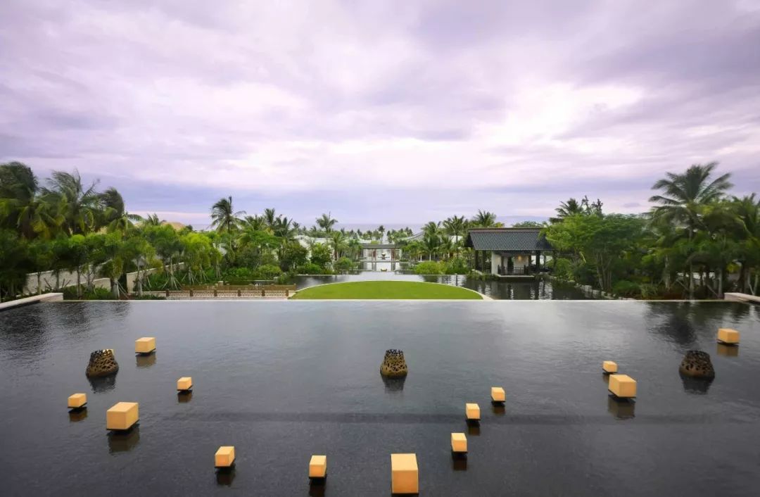 亚龙湾瑞吉张牙舞抓的酒店建筑其实象征着双龙戏珠。酒店用玻璃制成了主泳池面海一侧的边缘,使之成为一处热门拍照点。