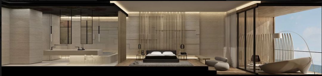 四季向来厌恶花拳绣腿,实用性和舒适性向来是四季酒店营造时的首要考量对象。从目前可见的客房设计图可见,房间确实沿袭了四季一贯的实用主义。主流房型采用套房格局,入户后第一进是睡房、第二进是全明的起居室和浴室、第三进是景观阳台。
