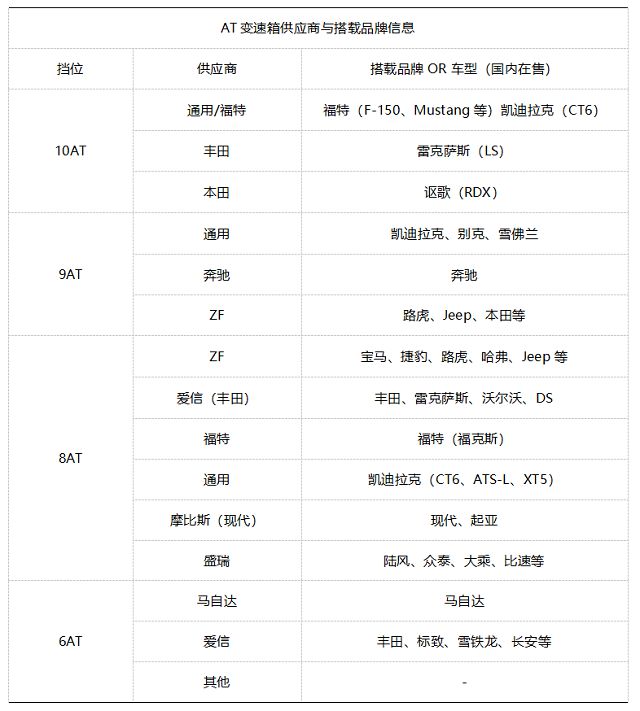 6AT多数合资及豪华品牌、海外零部件供应商都能造,数量众多固不一一列举。业界口碑较好的当属马自达自产的6AT以及爱信6AT了,其中爱信6AT有很多合资及自主品牌均在使用,马自达则为自用。