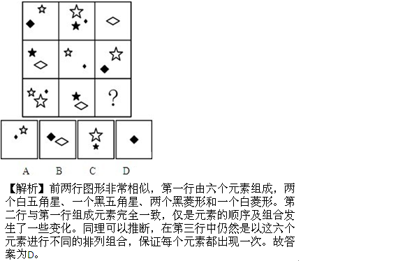 观察图形、每行图形都由轮廓相同的左、中、右三个部分构成,且前两行图形每行均出现三个“白面”、三个“阴影面”、两个“星”、一个“四小圆”,规律应用到第三行图形,缺啥补啥,还缺一个“白面”、一个“星”、一个“阴影面”,观察选项,只有B项符合。故正确答案为B。
