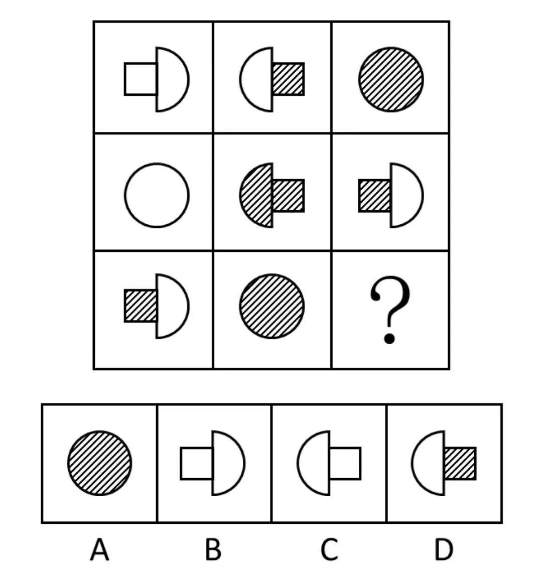观察发现第一行中,全白面、半阴影、全阴影的图形都出现,第二行图形中也是全白面、全阴影、半阴影的图形出现,第三行中半阴影、全阴影遍历规律是什么意思,问号处应为全白面的图形,排除A、D两项。比较B、C项的不同之处,“蘑菇”图形的方向不同,题干中第一行图形和第二行图形中的两个“蘑菇”朝向都是不同的,因此问号处应选一个和第三行图1中朝向不同的“蘑菇”,第三行图中的“蘑菇”是头朝右的,问号处应选择一个“蘑菇”头朝左的,只有C项符合,排除B项。故正确答案为C。