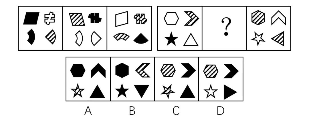 元素组成相似遍历规律是什么意思,考虑样式规律。观察第一组图形发现,每个图中都包含有四种不同的小元素,且相同位置的小元素都一样,颜色各不相同。可知本题考查的是小元素的遍历和小元素颜色的遍历规律。依照此规律,第二组图形中六边形分别是白色和横线,则中间图中六边形应该是黑色,排除C项和D项;第二组图形中五角星分别是黑色和白色,则中间图中的五角星应该是横线,排除B项。故正确答案为A。