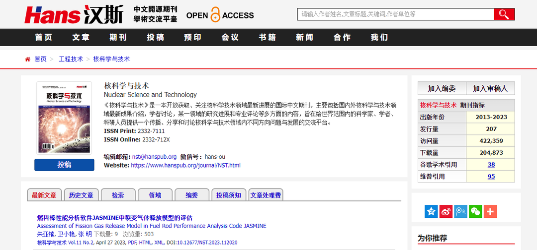 截至2020年12月,据谷歌学术统计科学技术与工程期刊,NST《核科学与技术》期刊文章已被引用科学技术与工程期刊,引用次数为14次。
