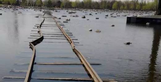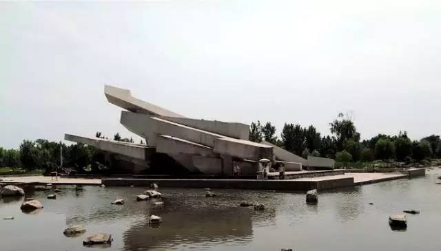 在雕塑周围的水池里,摆放着728块大小不一的石块唐山抗震纪念碑,寓意地震日期7月28日。而水池中一段扭曲变形的铁轨,则象征着唐山人民脑中永远挥之不去的曲折记忆。