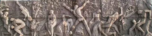 与铸造车车间遗址相望约四百米的,是一处足球场大小的水池。水池中央,有一座形如被放倒的积木条块一般的白色花岗岩主题雕塑。雕塑周围,还有几座展现震后灾民奋力自救、痛失亲人和企盼救援场面的黑色青铜雕塑。