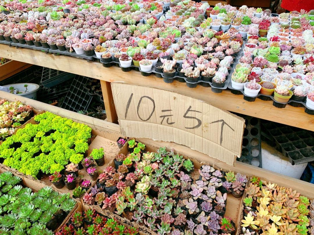 再往下走是多肉植物摊位,这里的多肉动不动就「白菜价」,价位比前几年低很多。10元5个,不是很讲究品种的肉友,随便来这捡走十几盆,也能铺满一阳台。