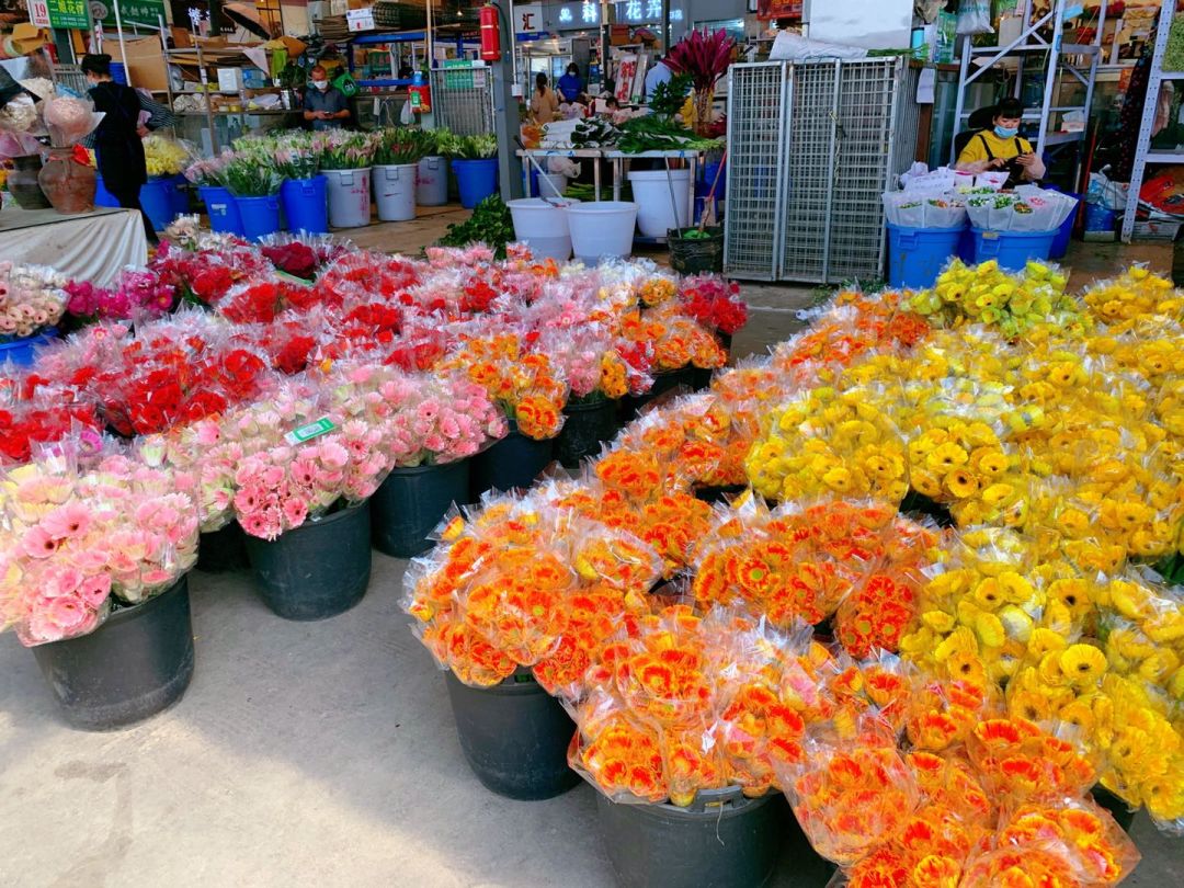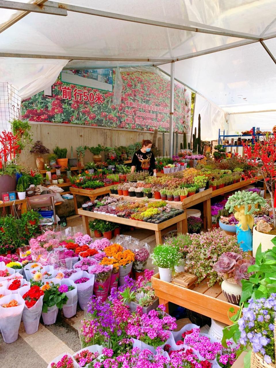 沿着这些摊位往里走大概几百米,左边拐进去就是大棚,里面主打售卖鲜花的各个摊位。