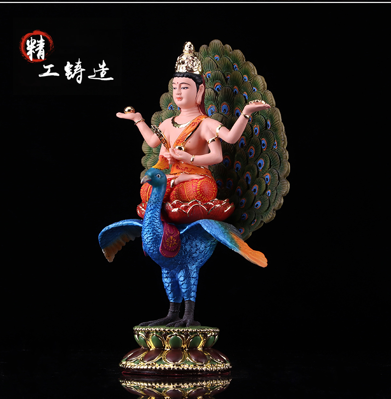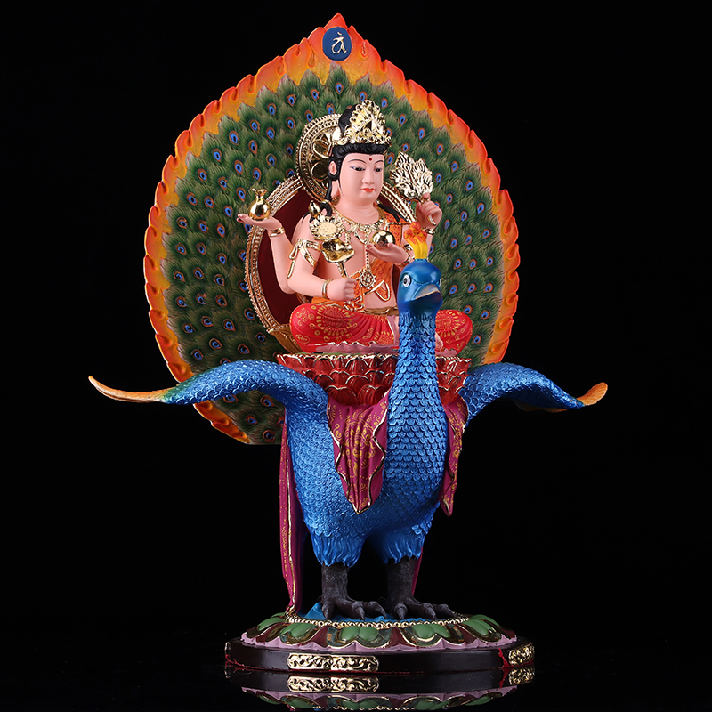 「孔雀明王」乃「佛母大孔雀明王」之简称,为大日如来(毗如遮那佛)所示现。祂有别于一般明王威吓忿怒之相,而是显得慈悲、庄严、寂静、凝定!若能多持诵此《孔雀明王咒》,可转乖戾成祥和、转斗争成礼让、转病痛成健康、转娑婆成净土!
