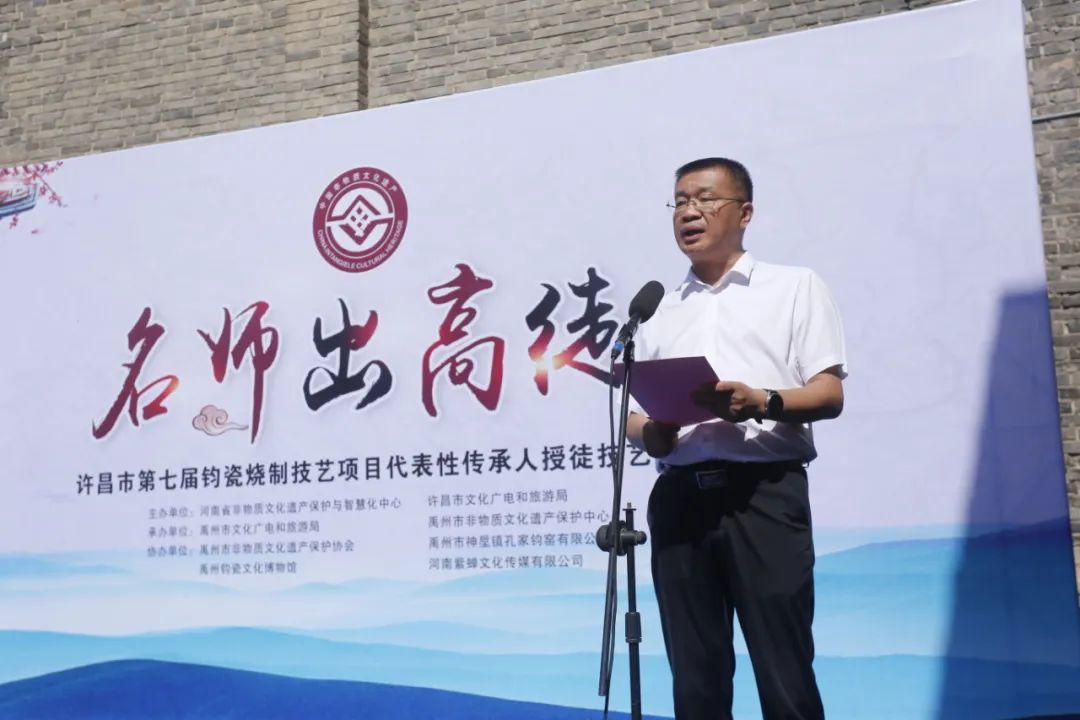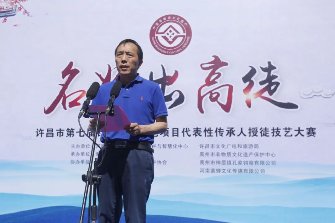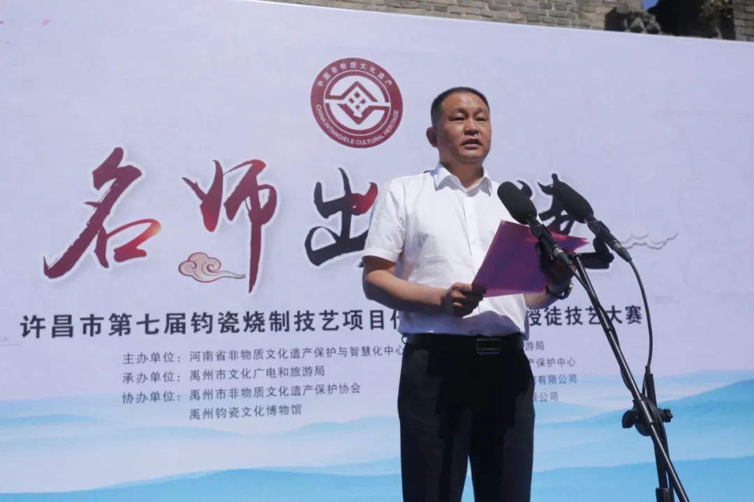 许昌市文化广电和旅游局党组成员、副局长段建伟在致辞中说,今年是第七届“名师出高徒”——许昌钧瓷烧制技艺传承人授徒技艺大赛,是我市重点打造的“文化和自然遗产日”非遗展演重要品牌活动。旨在通过大赛加强钧瓷烧制技艺交流,提升钧瓷烧制技艺水平,展示钧瓷文化魅力。大赛的持续举办对弘扬钧瓷文化、展示非遗风采,振兴传统工艺具有重要意义。我相信,通过这次活动必将对全市非遗保护传承和传统工艺振兴起到重要的助推作用,提升许昌非遗在全省的影响力,推动许昌市非遗传承发展再上新台阶。
