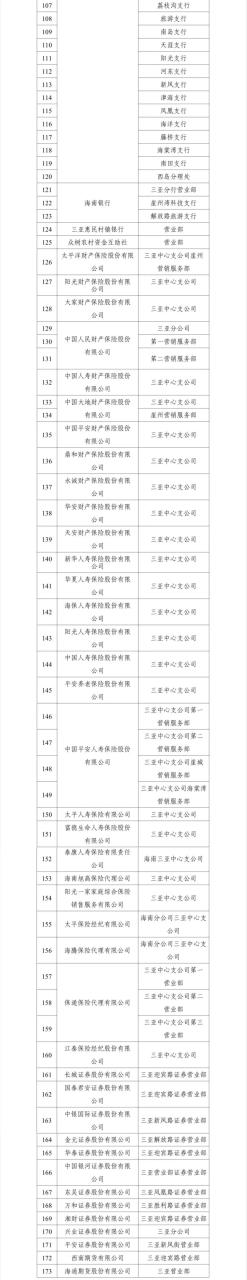 记者从三亚市金融发展局获悉,在三亚市新型冠状病毒肺炎疫情防控工作指挥部的指导下,截至9月21日,三亚正常营业的银行网点125个、保险网点35个、证券期货网点13个(附后)。全市尚余37个银行保险证券网点暂未对外营业。