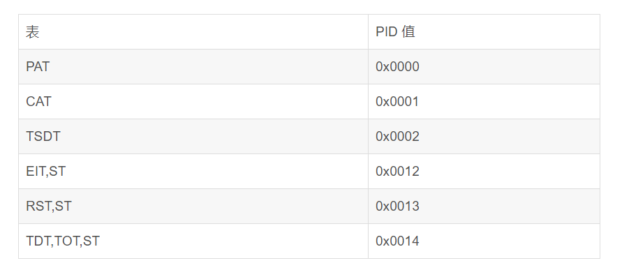 PID是TS流中唯一识别标志,Packet Data是什么内容就是由PID决定的。如果一个TS流中的一个Packet的Packet Header中的PID是0x0000,那么这个Packet的Packet Data就是DVB的PAT表而非其他类型数据(如Video、Audio或其他业务信息)。下表给出了一些表的PID值,这些值是固定的,不允许用于更改。