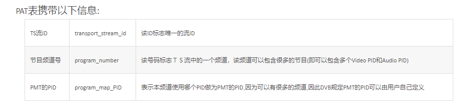 PAT表主要包含频道号码和每一个频道对应的PMT的PID号码,这些信息我们在处理PAT表格的时候会保存起来,以后会使用到这些数据。下面将PAT表的定义给出: