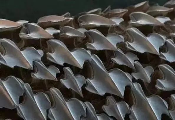 在我们的印象中不应该是皮肤越光滑受到的阻力越小吗?事实却并非如此,研究人员发现,当流体高速流动时,光滑物体表面上的速度和压力会严重分布不均,导致阻力变大。除此之外,研究人员对不同形状的沟槽表面进行了试验鲨鱼皮泳衣,最后发现对称的V形沟槽表面具有最佳的减阻效果。这也就是鲨鱼皮上的盾鳞结构。