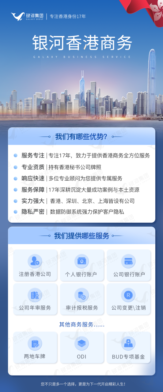 与此同时,银河集团还可以提供香港公司注册,公司开户,记账报税,年审审计,改股改董等港企一站式服务。
