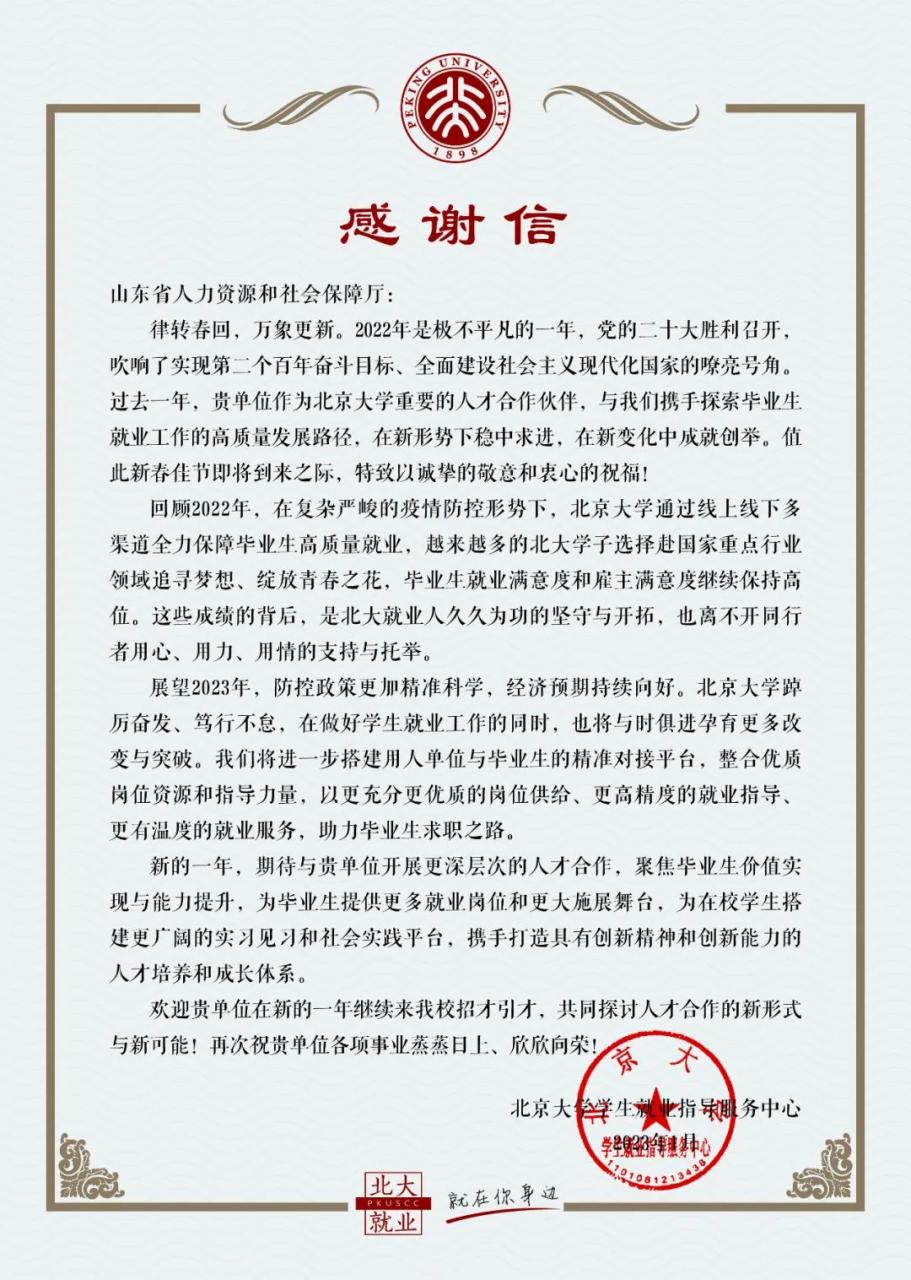 新年伊始,北京大学学生就业指导服务中心向省人力资源社会保障厅发来《感谢信》。《感谢信》指出,回顾2022年,省人力资源社会保障厅作为北京大学重要的人才合作伙伴,携手探索毕业生就业工作的高质量发展路径,北大毕业生就业满意度和雇主满意度继续保持高值。展望2023年,希望聚焦毕业生价值实现与能力提升,开展更深层次的人才合作,为毕业生提供更多就业岗位和更大施展舞台,为在校学生搭建更广阔的实习见习和社会实践平台北大资源学院,共同探讨人才合作的新形式与新可能。