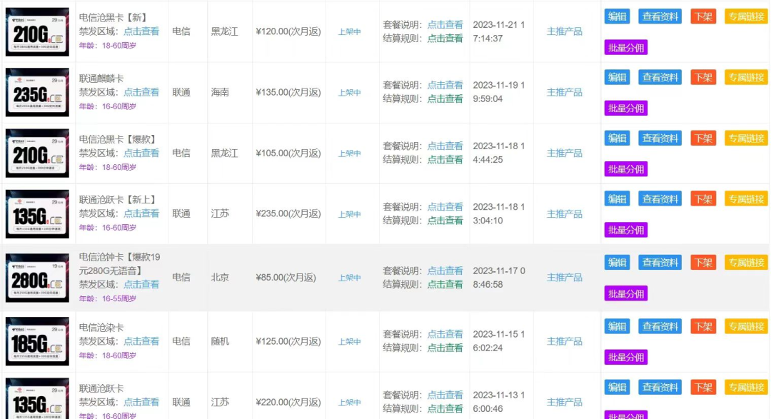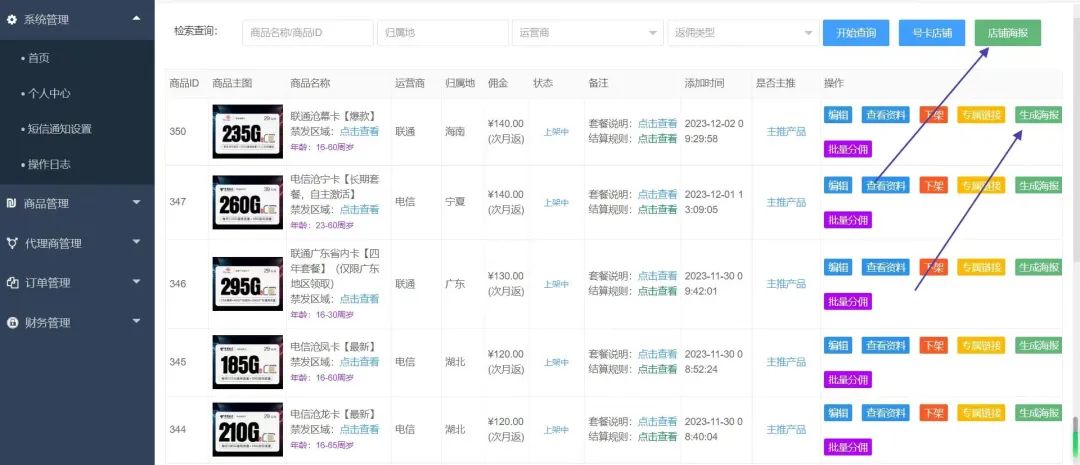 2、推广手机流量卡 打开号卡代理后台,找到商品列表板块; 选择需要的单品生成海报,也可以直接生成店铺海报,就可以正式去推广了。 到时候有需求的用户扫码申请号卡,激活成功后,佣金就会自动到你的后台。