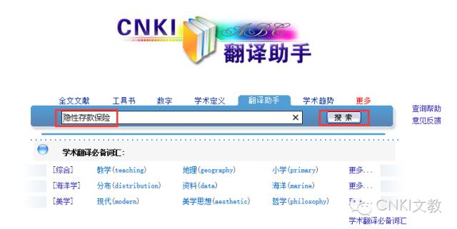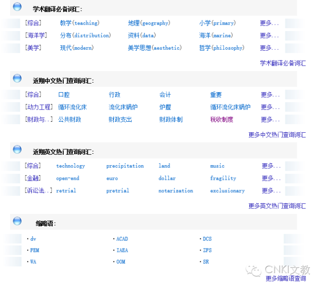 它不仅提供英汉词语、短语的翻译检索,还可以提供句子的翻译检索。”学术翻译必备词汇”(在CNKI翻译助手首页,如图)好用便利。