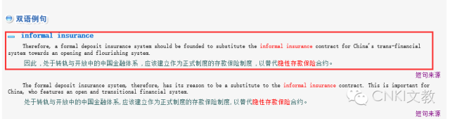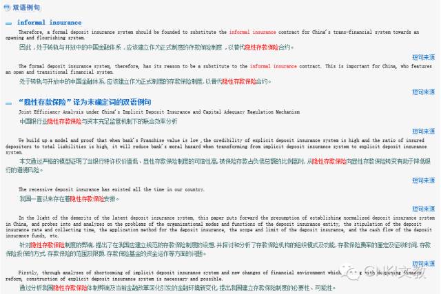 在具体语境中,翻译的释义才指向更明确,所以,我们需要更多的例句帮助我说文解义。第二部分的双语例句能很好的解决这个问题。”隐性存款保险”一词的短句和短句的翻译,请参见下图。
