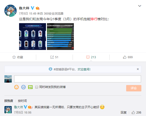 @鲁大师 发排行榜与安兔兔对比时带上了一句耐人寻味的话:“其实谁排第一无所谓啦,只要友商的主子开心就好。”